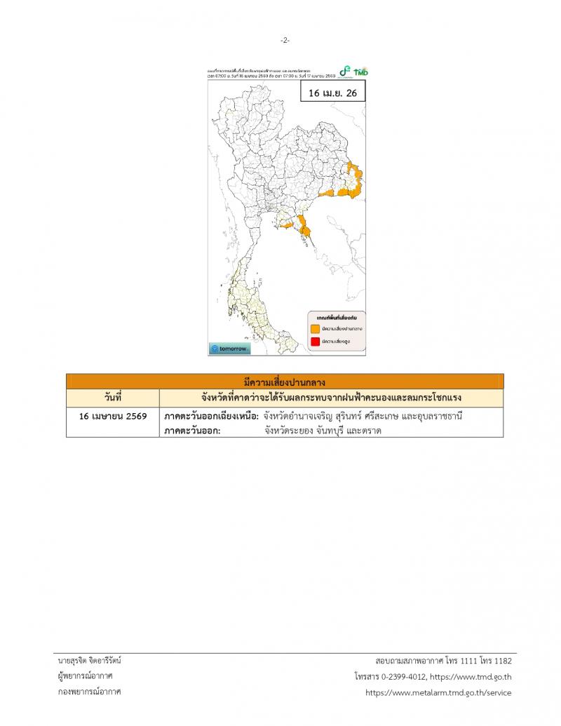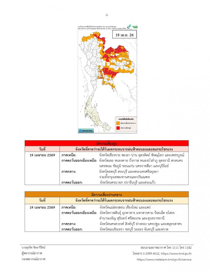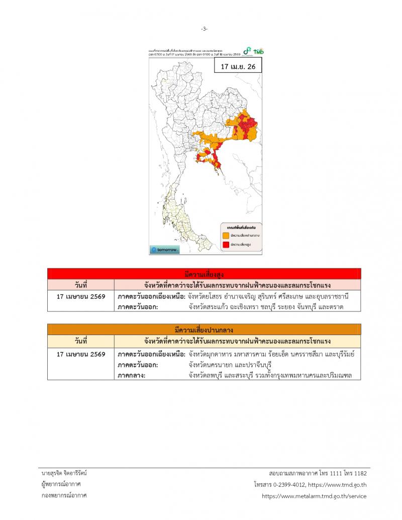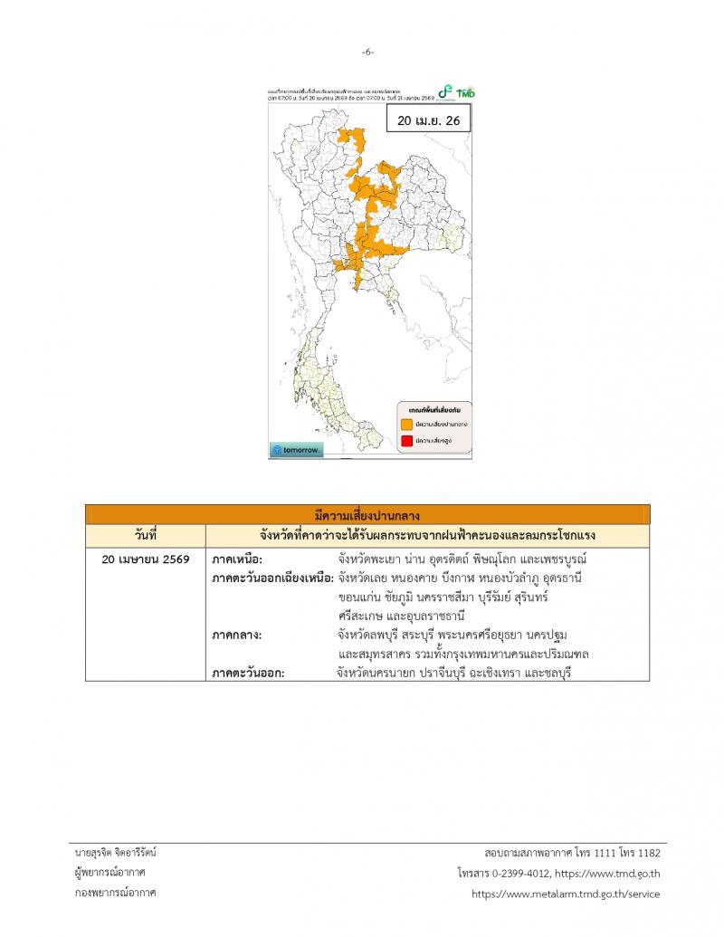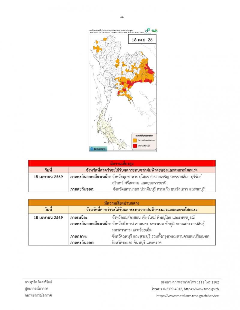 ประกาศกรมอุตุนิยมวิทยา เรื่อง พายุฤดูร้อนบริเวณประเทศไทยตอนบน (มีผลกระทบตั้งแต่วันที่ 16-20 เมษายน 2569) ฉบับที่ 4 (23/2569)
