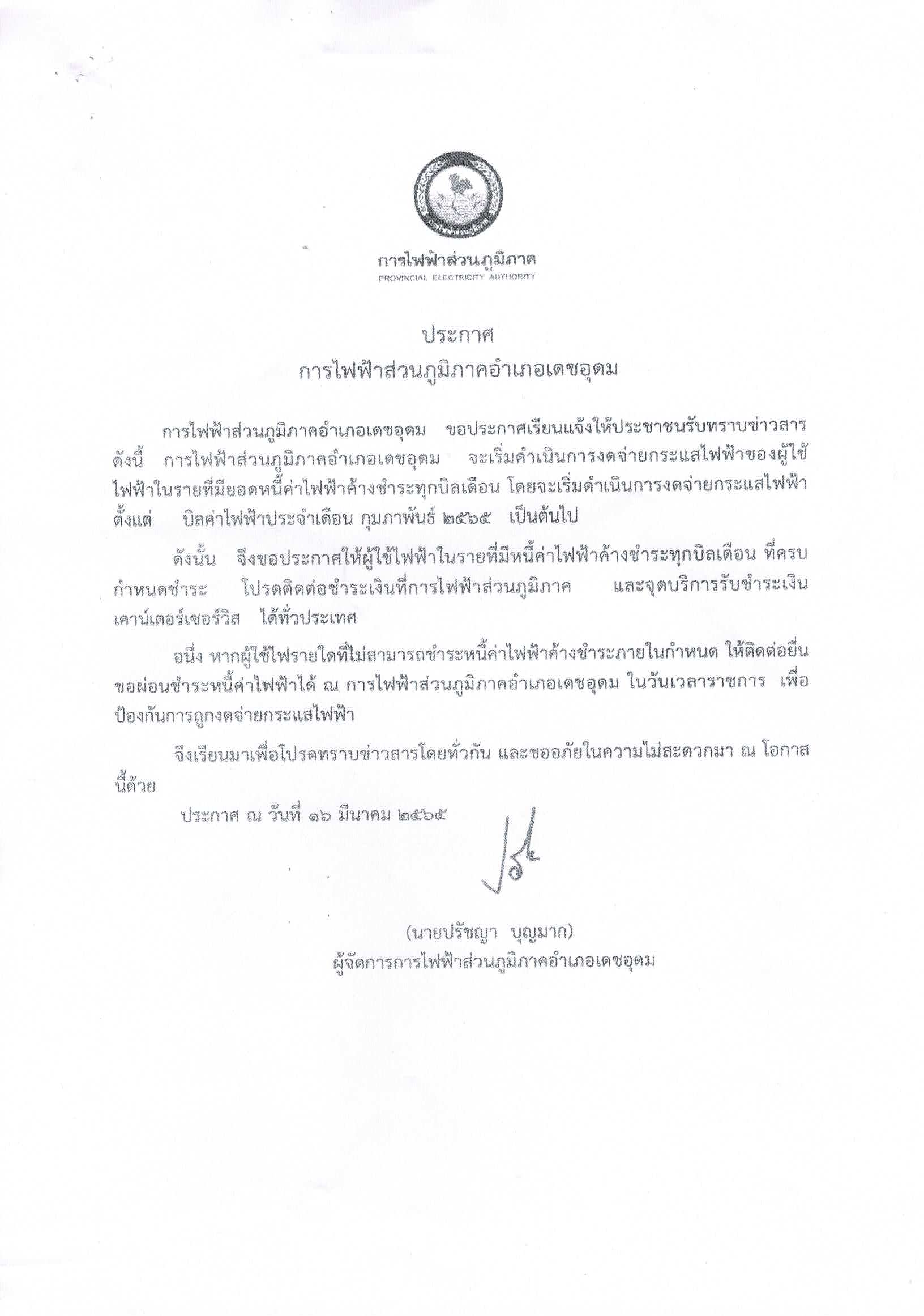 ประกาศประชาสัมพันธ์ เรื่อง การดำเนินการงดจ่ายกระแสไฟฟ้าของการไฟฟ้าส่วนภูมิภาคอำเภอเดชอุดม