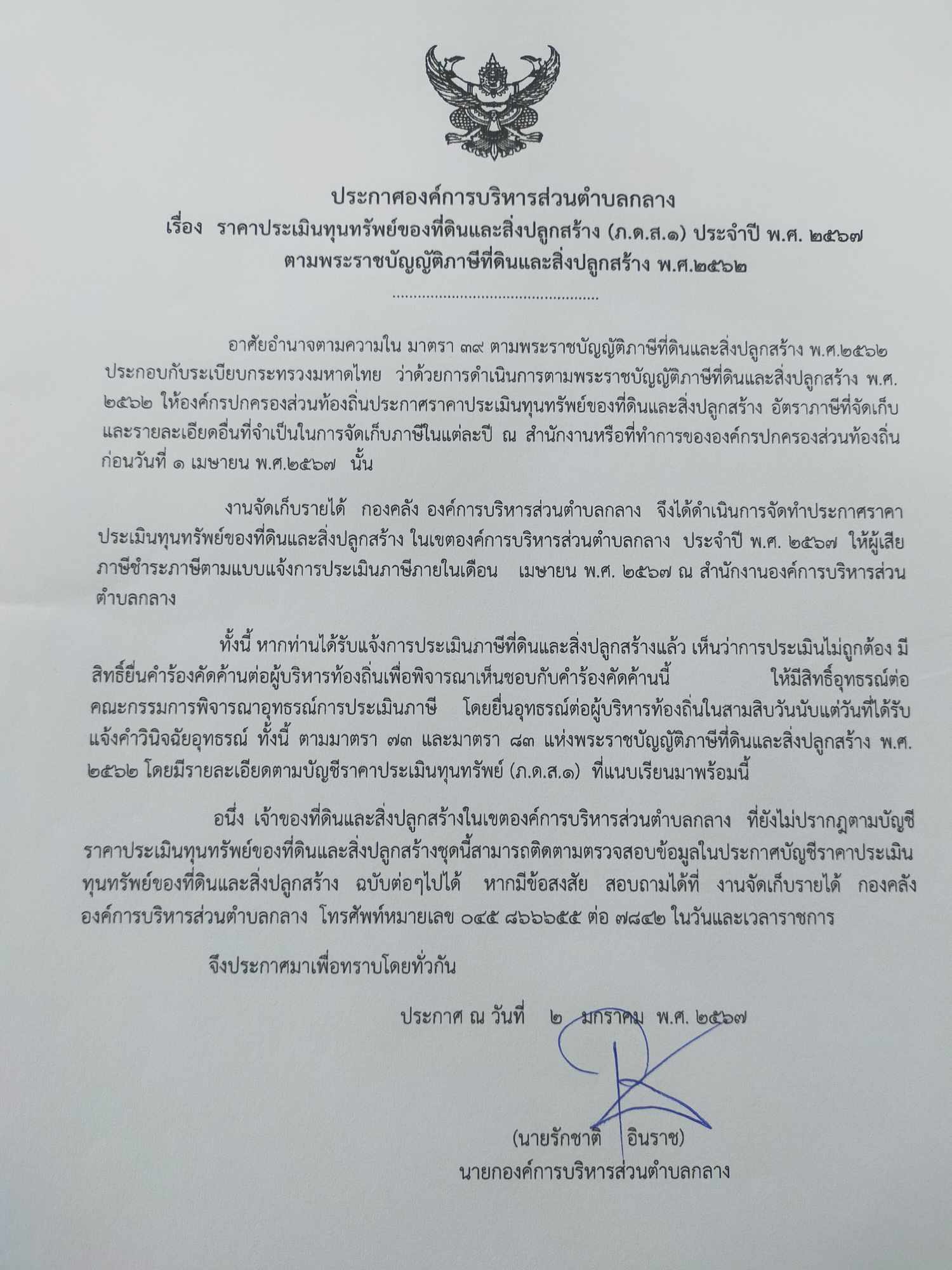 ประกาศราคาประเมินทุนทรัพย์ของที่ดินและสิ่งปลูกสร้าง (ภ.ด.ส.1) ประจำปี 2567