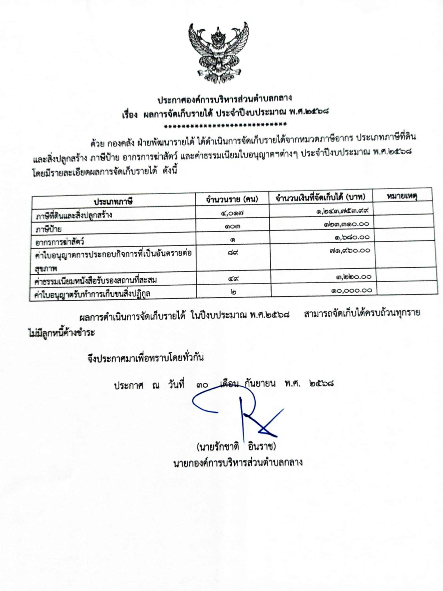 ชื่อเรื่อง : ประกาศองค์การบริหารส่วนตำบลกลาง เรื่อง ผลการจัดเก็บรายได้ประจำปีงบประมาณ พ.ศ. 2568