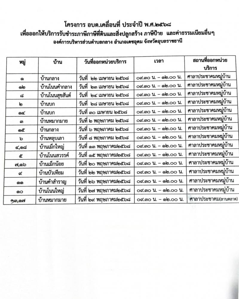 ประกาศประชาสัมพันธ์โครงการ อบต.เคลื่อนที่ ประจำปีงบประมาณ 2568 เพื่อบริการรับชำระภาษี นอกสถานที่ ตามจุดบริการ ทั้ง 18 หมู่บ้าน องค์การบริหารส่วนตำบลกลาง อำเภอเดชอุดม จังหวัดอุบลราชธานี