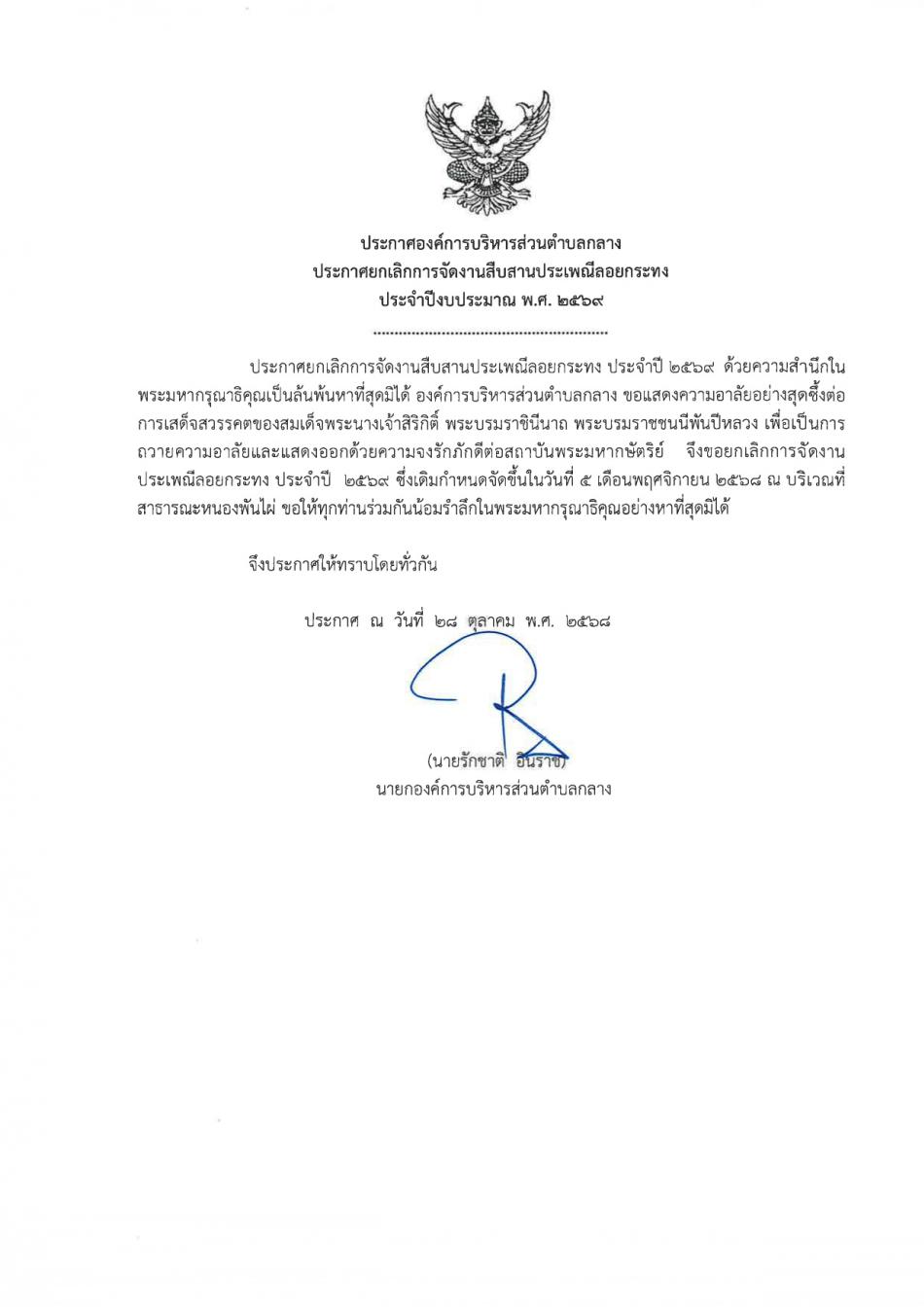 ประกาศองค์การบริหารส่วนตำบลกลาง ประกาศยกเลิกการจัดงานสืบสานประเพณีลอยกระทง ประจำปีงบประมาณ พ.ศ. 2569 [28 ตุลาคม 2568]