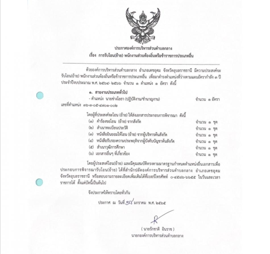 ประกาศองค์การบริหารส่วนตำบลกลาง เรื่อง การรับโอน (ย้าย) พนักงานส่วนท้องถิ่นหรือข้าราชการประเภทอื่น [18 มกราคม 2565]