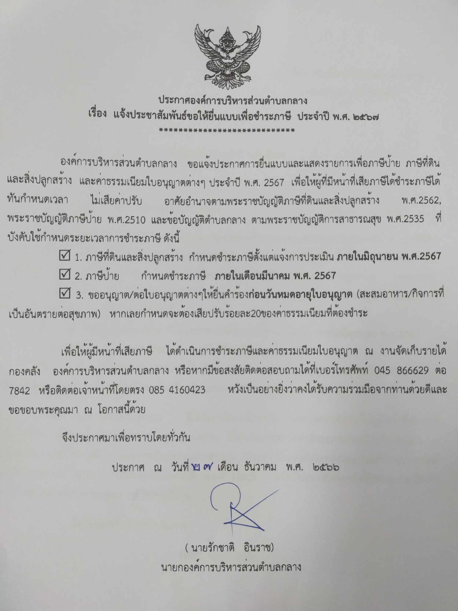 แจ้งประชาสัมพันธ์ขอให้ยื่นแบบเพื่อชำระภาษี ประจำปี พ.ศ.2567